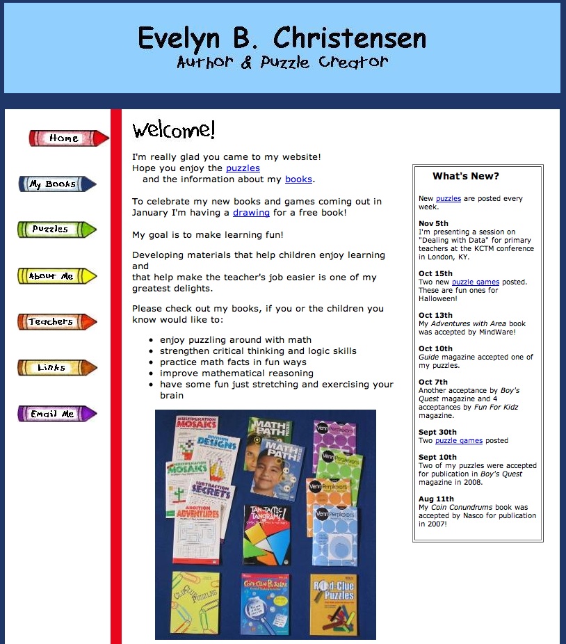 "Julie Cohen did a wonderful job of critiquing my website and gave me lots of helpful feedback and valuable suggestions! My site isn't a fancy one with lots of "bells and whistles" because my son helped me design it with just basic html, but Julie was able to work within our limitations and suggest ways to improve navigation, text layout, color appearance, usefulness of links, and general site appeal. She also helped me to consider ways to promote my books better. I really appreciated Julie's willingness to share her expertise with me and recommend her to anybody who wants assistance in improving their site."